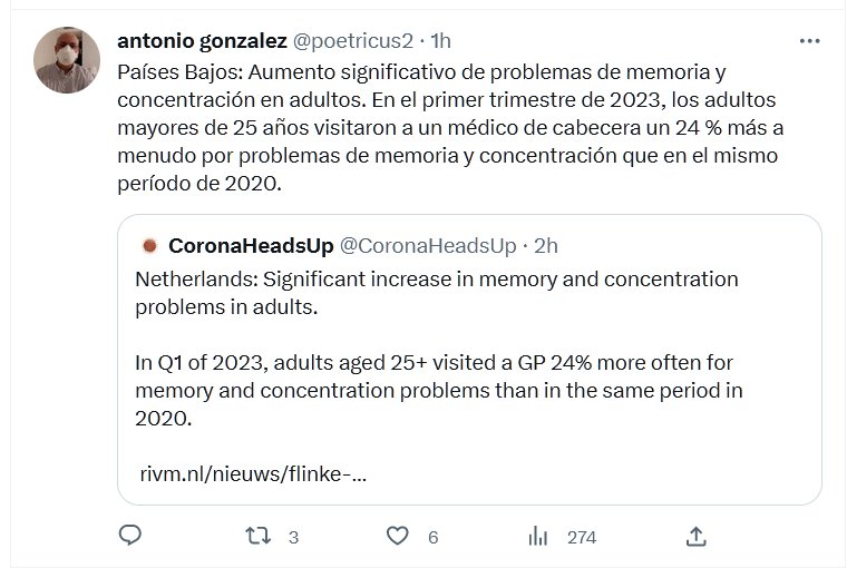 POSTCOVID HACE ESTRAGOS Países Bajos: Aumento significativo de problemas de memoria y concentración en adultos. En el primer trimestre de 2023, los adultos mayores de 25 años visitaron a un médico de cabecera un 24 % más a menudo por problemas de memoria y concentración que en el mismo período de 2020.
