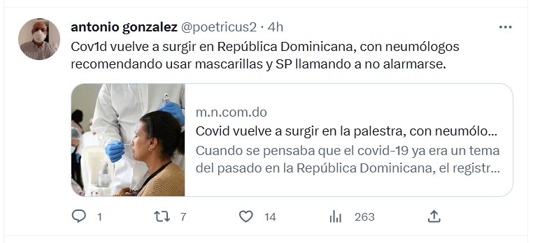 Covid vuelve a surgir en República Dominicana, con neumólogos recomendando usar mascarillas Posted on junio 5, 2023 por coronado https://m.n.com.do/2023/06/05/covid-vuelve-a-surgir-en-la-palestra-con-neumologos-recomendando-usar-mascarillas-y-sp-llamando-a-no-alarmarse/