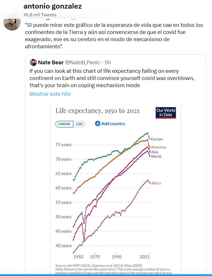 Si puedes ver este gráfico de la caída de la esperanza de vida en todos los continentes de la Tierra y seguir convenciéndote de que COVID fue exagerado, es que tu cerebro está en modo mecanismo de REPETIR LO QUE LOS OTROS DICEN