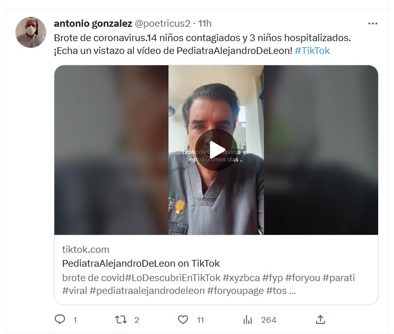 Brote de coronavirus.14 niños contagiados y 3 niños hospitalizados. Posted on junio 7, 2023 por coronado https://www.tiktok.com/@pediatraalejandrodeleon/video/7241305488493710597?_t=8cxIueDINdD&_r=1