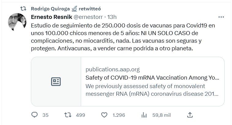 DR. Ernesto Resnik @ernestorr · Estudio de seguimiento de 250.000 dosis de vacunas para Covid19 en unos 100.000 chicos menores de 5 años: NI UN SOLO CASO de complicaciones, no miocarditis, nada. Las vacunas son seguras y protegen. Antivacunas, a vender carne podrida a otro planeta.