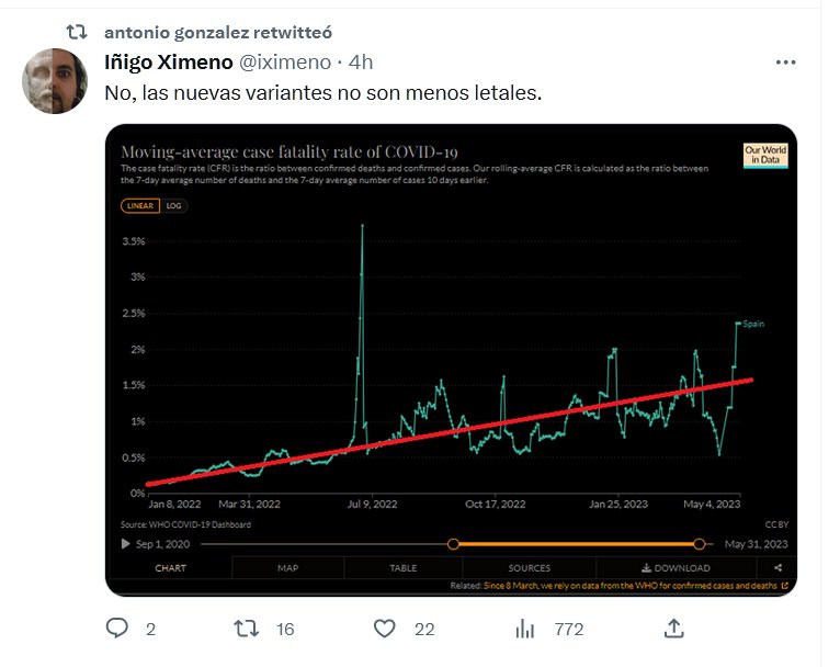 No, las nuevas variantes no son menos letales Posted on junio 7, 2023 por coronado https://twitter.com/iximeno/status/1666458646060859399