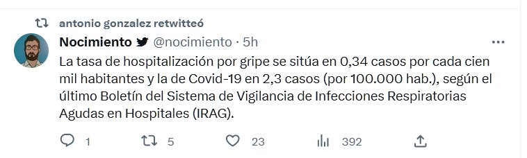 La tasa de hospitalización por gripe se sitúa en 0,34 casos por cada cien mil habitantes y la de Covid-19 en 2,3 casos (por 100.000 hab.), según el último Boletín del Sistema de Vigilancia de Infecciones Respiratorias Agudas en Hospitales (IRAG).
