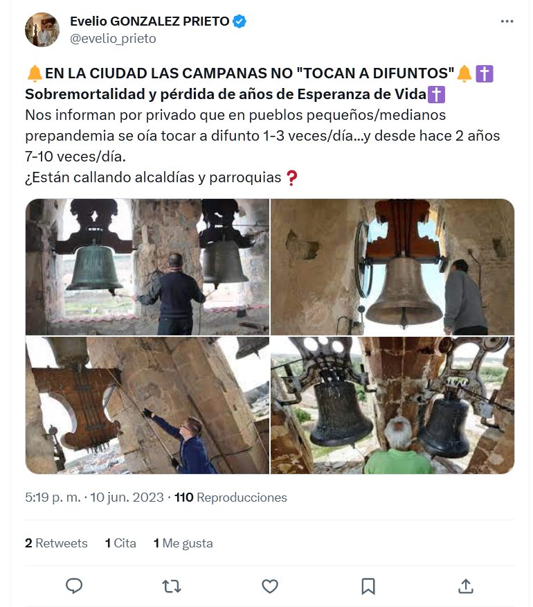 🔔EN LA CIUDAD LAS CAMPANAS NO «TOCAN A DIFUNTOS»🔔✝️Sobremortalidad y pérdida de años de Esperanza de Vida✝️ Nos informan por privado que en pueblos pequeños/medianos prepandemia se oía tocar a difunto 1-3 veces/día…y desde hace 2 años 7-10 veces/día. ¿Están callando alcaldías y parroquias❓