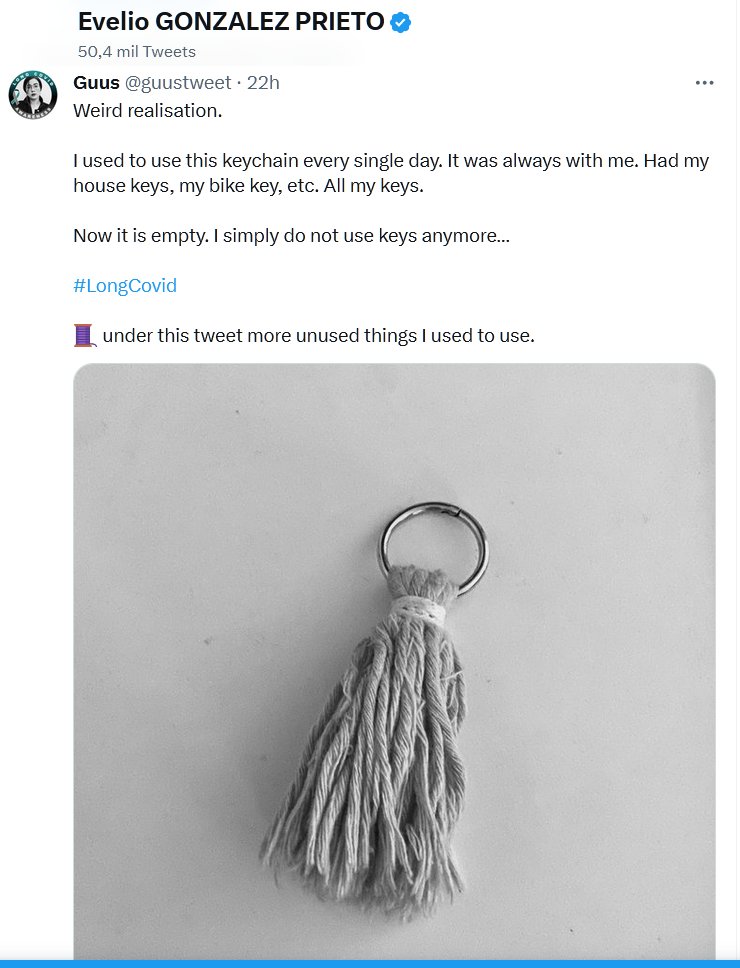TESTIMONIOS Me he dado cuenta de algo raro. Solía usar este llavero todos los días. Siempre estaba conmigo. Tenía las llaves de mi casa, de mi bicicleta, etc. Todas mis llaves. Ahora está vacío. Simplemente ya no uso llaves… #LongCovid