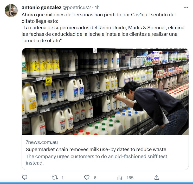 EL CAPITALISMO SE SUPERA Ahora que millones de personas han perdido por Cov1d el sentido del olfato llega esto: «La cadena de supermercados del Reino Unido, Marks & Spencer, elimina las fechas de caducidad de la leche e insta a los clientes a realizar una «prueba de olfato».