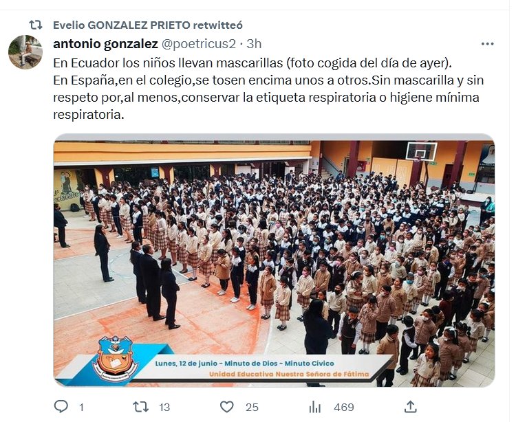 En Ecuador los niños llevan mascarillas … En España,en el colegio,se tosen encima unos a otros.Sin mascarilla y sin respeto por,al menos,conservar la etiqueta respiratoria o higiene mínima respiratoria.