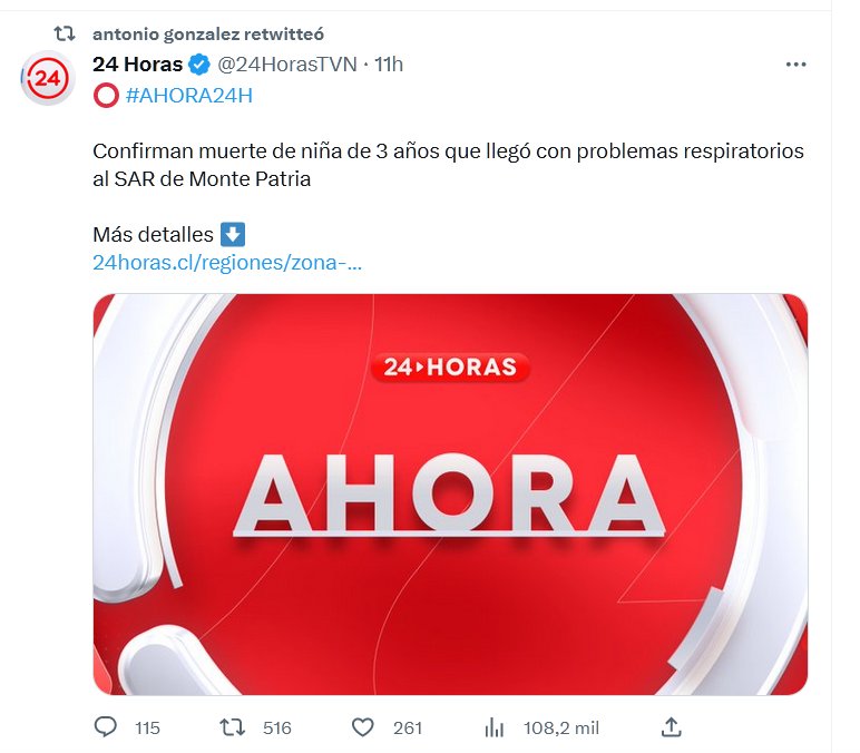 CHILE ⭕ #AHORA24H Confirman muerte de niña de 3 años que llegó con problemas respiratorios al SAR de Monte Patria Posted on junio 14, 2023 por coronado https://www.24horas.cl/regiones/zona-norte/coquimbo/nina-de-tres-anos-muere-tras-llegar-con-problemas-respiratorios-al-sar-monte-patria