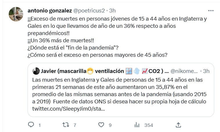 ¡¡Exceso de muertes en personas jóvenes de 15 a 44 años en Inglaterra y Gales en lo que llevamos de año de un 36% respecto a años prepandémicos!! ¡¡Un 36% más de muertes!! ¿Dónde está el «fin de la pandemia»? ¿Cómo será el exceso en personas mayores de 45 años?