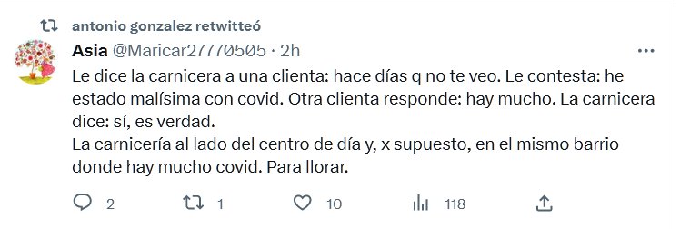 TESTIMONIOS Le dice la carnicera a una clienta: hace días q no te veo. Le contesta: he estado malísima con covid. Otra clienta responde: hay mucho. La carnicera dice: sí, es verdad. La carnicería al lado del centro de día y, x supuesto, en el mismo barrio donde hay mucho covid. Para llorar.