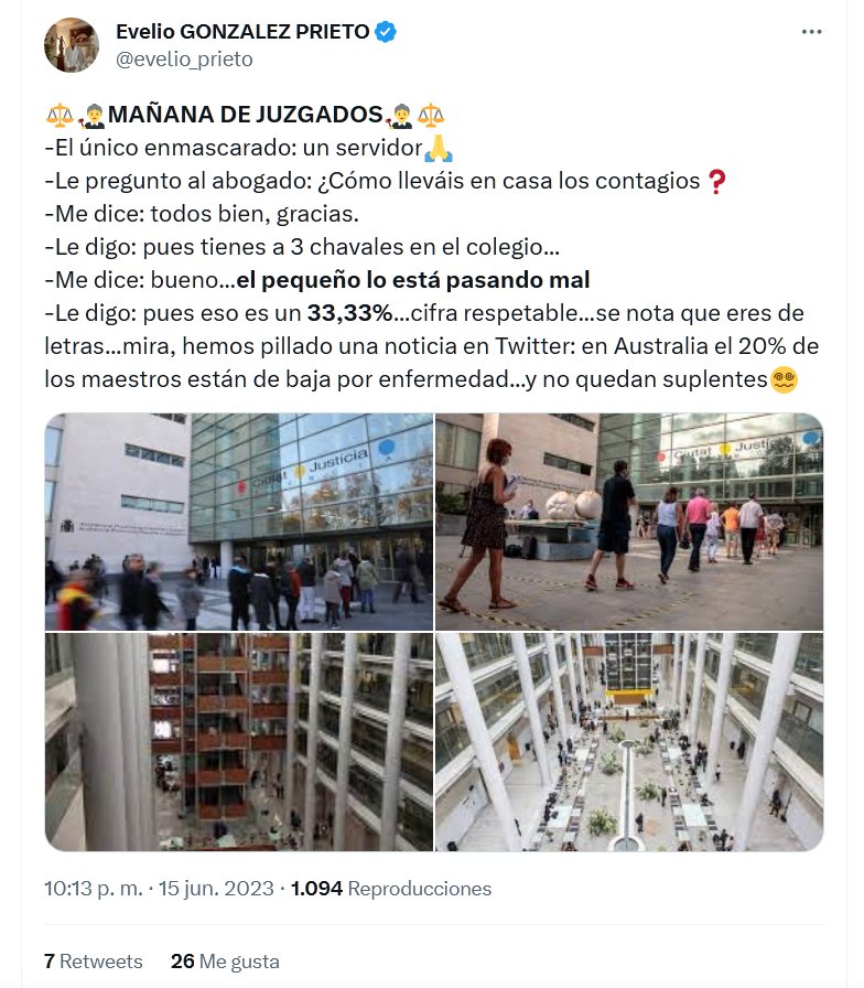 TESTIMONIOS ⚖️👩⚖️MAÑANA DE JUZGADOS👩⚖️⚖️ -El único enmascarado: un servidor🙏 -Le pregunto al abogado: ¿Cómo lleváis en casa los contagios❓ -Me dice: todos bien, gracias. -Le digo: pues tienes a 3 chavales en el colegio… -Me dice: bueno…el pequeño lo está pasando mal -Le digo: pues eso es un 33,33%…cifra respetable…se nota que eres de letras…mira, hemos pillado una noticia en Twitter: en Australia el 20% de los maestros están de baja por enfermedad…y no quedan suplentes😵💫