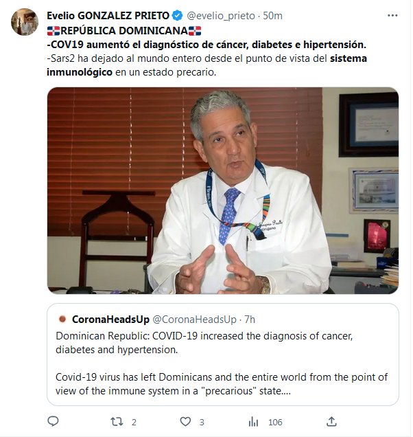 🇩🇴REPÚBLICA DOMINICANA🇩🇴 -COV19 aumentó el diagnóstico de cáncer, diabetes e hipertensión. -Sars2 ha dejado al mundo entero desde el punto de vista del sistema inmunológico en un estado precario.