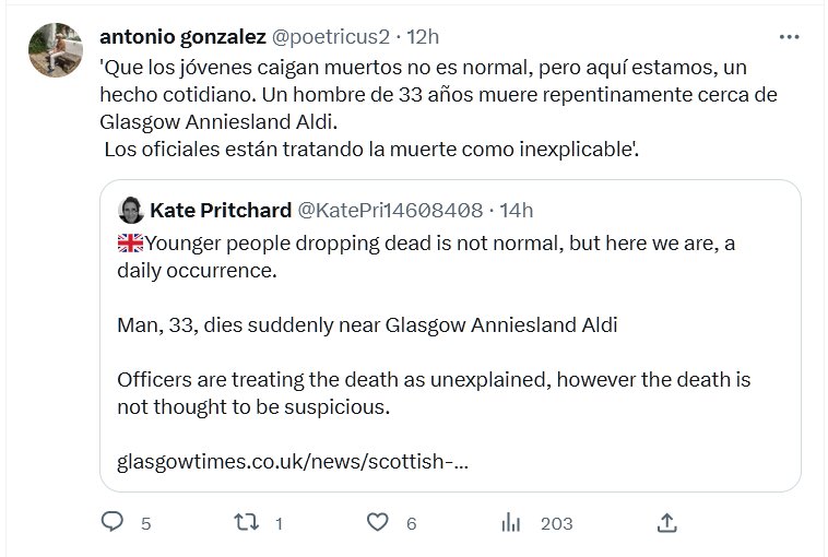 TESTIMONIOS ‘Que los jóvenes caigan muertos no es normal, pero aquí estamos, un hecho cotidiano. Un hombre de 33 años muere repentinamente cerca de Glasgow Anniesland Aldi. Los oficiales están tratando la muerte como inexplicable’.
