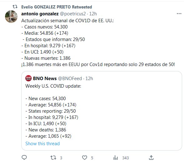Actualización semanal de COV1D de EE. UU.: – Casos nuevos: 54.300 – Media: 54.856 (+174) – Estados que informan: 29/50 – En hospital: 9.279 (+167) – En UCI: 1.490 (+50) – Nuevas muertes: 1.386 ¡1.386 muertes más en EEUU por Cov1d reportando solo 29 estados de 50!