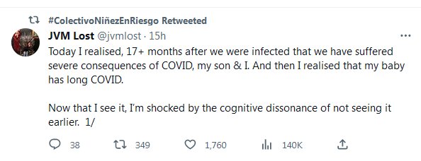 TESTIMONIOS (EN INGLÉS) Hoy me di cuenta, más de 17 meses después de que nos infectáramos, que hemos sufrido graves consecuencias de COVID, mi hijo y yo. Y luego me di cuenta de que mi bebé tiene COVID desde hace mucho tiempo. Ahora que lo veo, me sorprende la disonancia cognitiva de no haberlo visto antes.