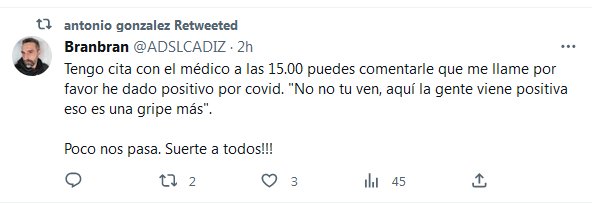 TESTIMONIOS «Tengo cita con el médico a las 15.00 puedes comentarle que me llame por favor he dado positivo por covid. «No no tu ven, aquí la gente viene positiva eso es una gripe más». Poco nos pasa. Suerte a todos!!!»