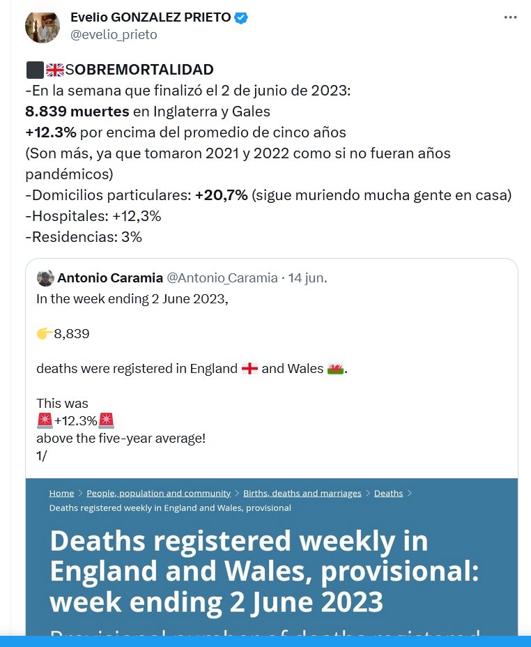 ¿1º MUNDO? ⬛️🇬🇧SOBREMORTALIDAD -En la semana que finalizó el 2 de junio de 2023: 8.839 muertes en Inglaterra y Gales +12.3% por encima del promedio de cinco años (Son más, ya que tomaron 2021 y 2022 como si no fueran años pandémicos) -Domicilios particulares: +20,7% (sigue muriendo mucha gente en casa) -Hospitales: +12,3% -Residencias: 3%