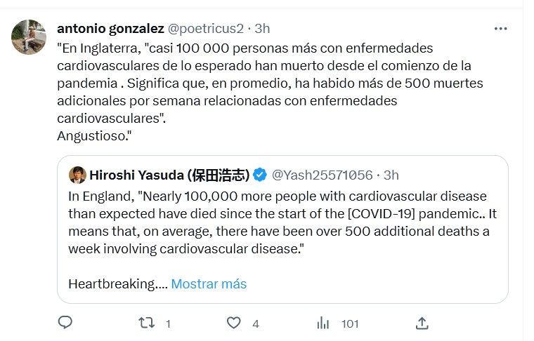 «En Inglaterra, «casi 100 000 personas más con enfermedades cardiovasculares de lo esperado han muerto desde el comienzo de la pandemia . Significa que, en promedio, ha habido más de 500 muertes adicionales por semana relacionadas con enfermedades cardiovasculares». Angustioso.»