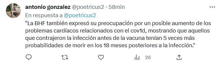 «La BHF también expresó su preocupación por un posible aumento de los problemas cardíacos relacionados con el cov1d, mostrando que aquellos que contrajeron la infección antes de la vacuna tenían 5 veces más probabilidades de morir en los 18 meses posteriores a la infección.»