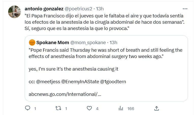 «El Papa Francisco dijo el jueves que le faltaba el aire y que todavía sentía los efectos de la anestesia de la cirugía abdominal de hace dos semanas». Sí, seguro que es la anestesia la que lo provoca.»