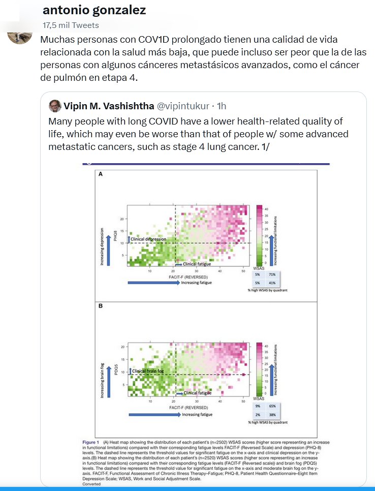 Muchas personas con COV1D prolongado tienen una calidad de vida relacionada con la salud más baja, que puede incluso ser peor que la de las personas con algunos cánceres metastásicos avanzados, como el cáncer de pulmón en etapa 4.