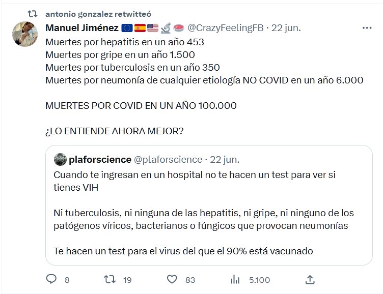 Muertes por hepatitis en un año 453 Muertes por gripe en un año 1.500 Muertes por tuberculosis en un año 350 Muertes por neumonía de cualquier etiología NO COVID en un año 6.000 MUERTES POR COVID EN UN AÑO 100.000 ¿LO ENTIENDE AHORA MEJOR?