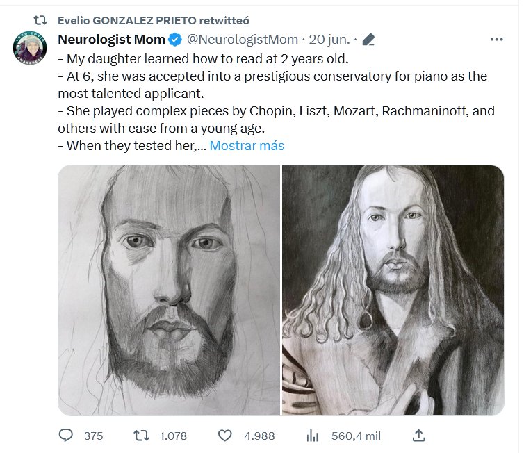 - Mi hija aprendió a leer a los 2 años. - A los 6 años, fue aceptada en un prestigioso conservatorio de piano como la candidata más talentosa. - Tocó piezas complejas de Chopin, Liszt, Mozart, Rachmaninoff y otros con facilidad desde una edad temprana. - Cuando la evaluaron, su puntaje de coeficiente intelectual estaba por encima de 150. - También era una artista talentosa y tuvo su primera exposición de arte a los 7 años (puedes ver una de sus obras de arte de cuando tenía 9 años). - Como estudiante de secundaria, sobresalió académicamente y estaba en camino de completar todas las clases de álgebra y geometría con sobresalientes. -Quería ser neurocientífica como sus padres. - Desafortunadamente, ahora vive en agonía con un dolor insoportable día y noche debido a neuroCOVID/COVID largo/MECFS. - Es desgarrador ver que Estados Unidos pierde tantos niños, incluidas algunas de sus mentes más brillantes, aparentemente sin motivo alguno.
