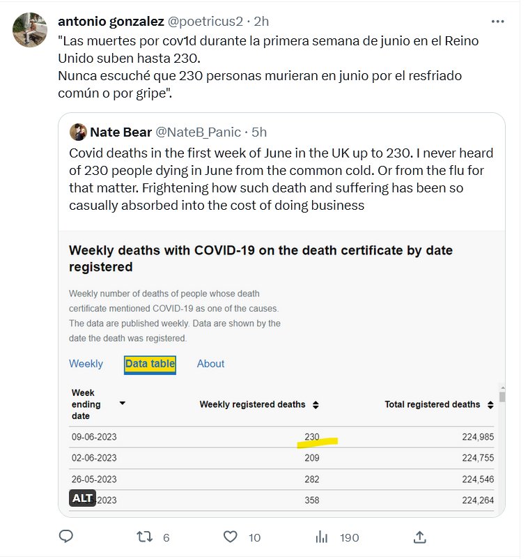 «Las muertes por covid durante la primera semana de junio en el Reino Unido suben hasta 230. Nunca escuché que 230 personas murieran en junio por el resfriado común o por gripe». Posted on junio 24, 2023 por coronado