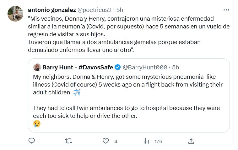 TESTIMONIOS «Mis vecinos, Donna y Henry, contrajeron una misteriosa enfermedad similar a la neumonía (Covid, por supuesto) hace 5 semanas en un vuelo de regreso de visitar a sus hijos. Tuvieron que llamar a dos ambulancias gemelas porque estaban demasiado enfermos PARA llevar uno al otro».