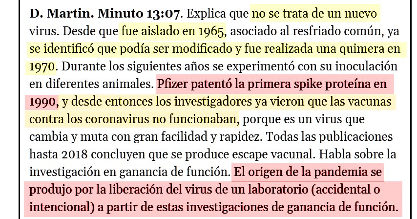 COVID MADE IN USA? «Explica que no se trata de un nuevo virus. Desde que fue aislado en 1965, asociado al resfriado común, ya se identificó que podía ser modificado y fue realizada una quimera en 1970. Durante los siguientes años se experimentó con su inoculación en diferentes animales. Pfizer patentó la primera spike proteína en 1990, y desde entonces los investigadores ya vieron que las vacunas contra los coronavirus no funcionaban, porque es un virus que cambia y muta con gran facilidad y rapidez»