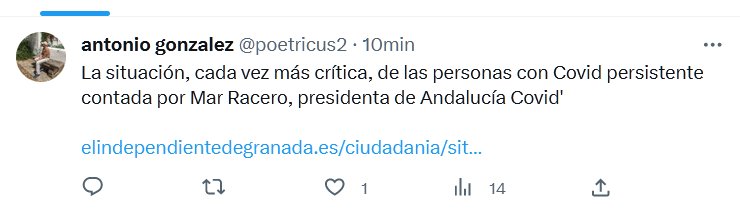 La situación, cada vez más crítica, de las personas con Covid persistente contada por Mar Racero, presidenta de Andalucía Covid’ Posted on junio 27, 2023 por coronado https://www.elindependientedegranada.es/ciudadania/situacion-cada-vez-mas-critica-personas-con-covid-persistente-contada-mar-racero
