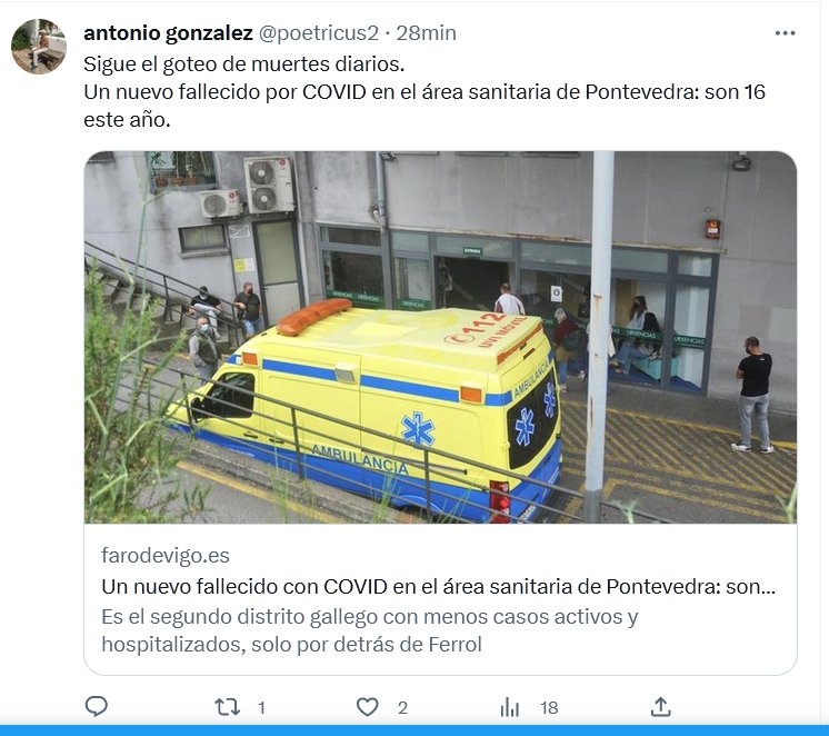 Sigue el goteo de muertes diarios. Un nuevo fallecido por COVID en el área sanitaria de Pontevedra: son 16 este año. Posted on junio 27, 2023 por coronado