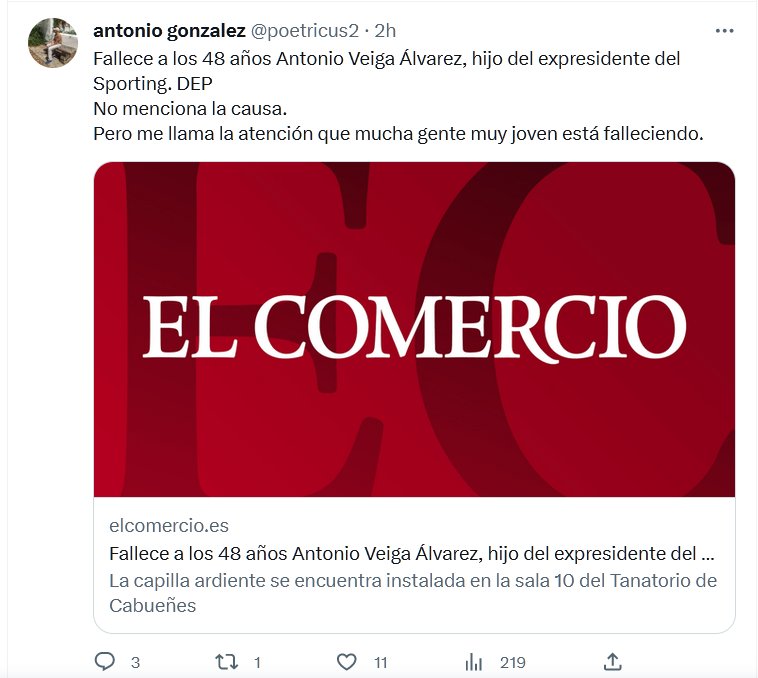 COVINCÓGNITA Fallece a los 48 años Antonio Veiga Álvarez, hijo del expresidente del Sporting. DEP No menciona la causa. Pero me llama la atención que mucha gente muy joven está falleciendo. Posted on junio 29, 2023 por coronado