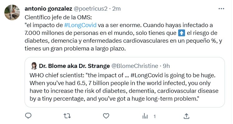 Científico jefe de la OMS: «el impacto de #LongCovid va a ser enorme. Cuando hayas infectado a 7.000 millones de personas en el mundo, solo tienes que ⬆️ SUBIR el riesgo de diabetes, demencia y enfermedades cardiovasculares en un pequeño %, y tienes un gran problema a largo plazo.