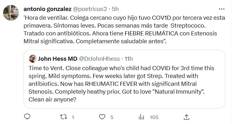 TESTIMONIOS ‘Hora de ventilar. Colega cercano cuyo hijo tuvo COV1D por tercera vez esta primavera. Síntomas leves. Pocas semanas más tarde Streptococo. Tratado con antibióticos. Ahora tiene FIEBRE REUMÁTICA con Estenosis Mitral significativa. Completamente saludable antes».