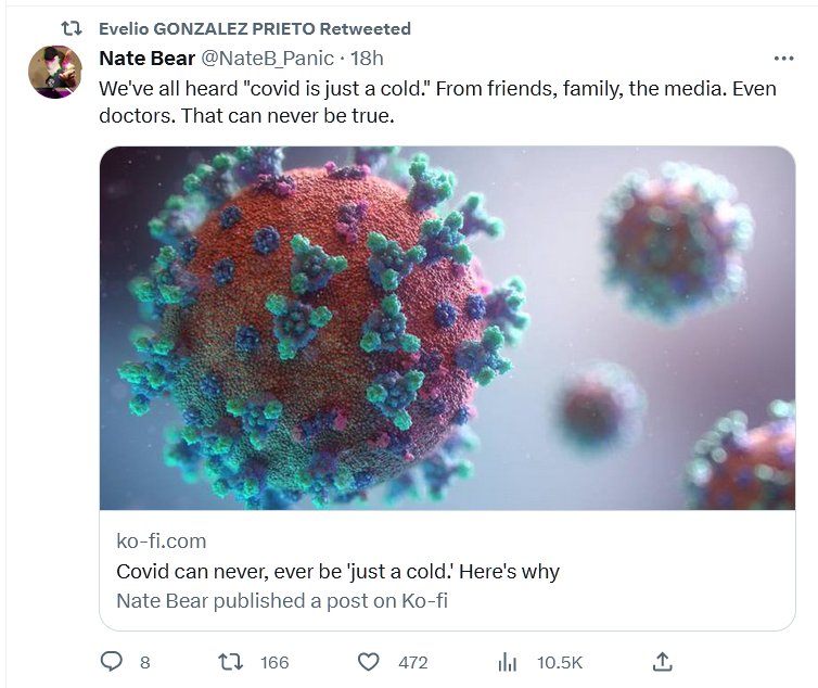 EN INGLÉS Todos hemos escuchado «covid es solo un resfriado». De amigos, familiares, los medios de comunicación. Incluso los médicos. Eso nunca puede ser verdad. Posted on julio 1, 2023 por coronado https://ko-fi.com/Post/Why-covid-can-never-ever-be-just-a-cold-Y8Y3MRES8