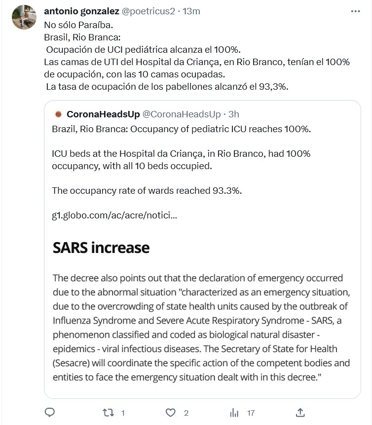 No sólo Paraíba. Brasil, Rio Branca: Ocupación de UCI pediátrica alcanza el 100%. Las camas de UTI del Hospital da Criança, en Rio Branco, tenían el 100% de ocupación, con las 10 camas ocupadas. La tasa de ocupación de los pabellones alcanzó el 93,3%.