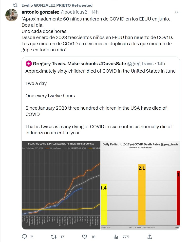 «Aproximadamente 60 niños murieron de COVID en los EEUU en junio. Dos al dia. Uno cada doce horas. Desde enero de 2023 trescientos niños en EEUU han muerto de COV1D. Los que mueren de COV1D en seis meses duplican a los que mueren de gripe en todo un año».