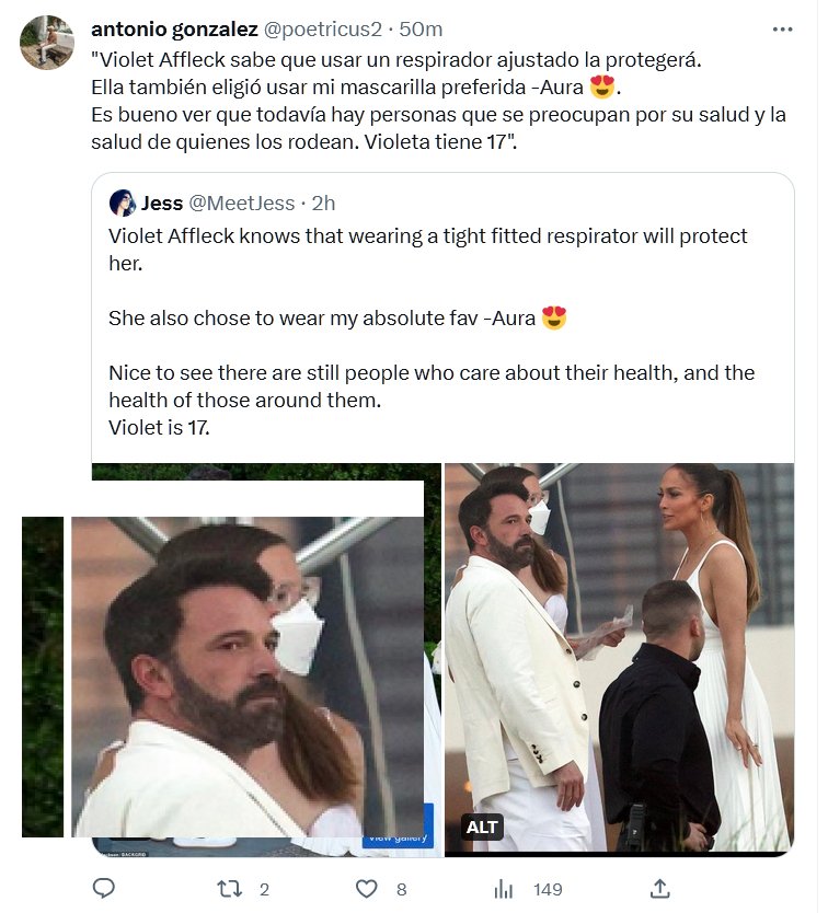 17 AÑOS Y MÁS MADURA Y PRUDENTE QUE TODOS! «Violet Affleck sabe que usar un respirador (BARBIJO, MASCARILLA) ajustado la protegerá. Ella también eligió usar mi mascarilla preferida -Aura 😍. Es bueno ver que todavía hay personas que se preocupan por su salud y la salud de quienes los rodean. Violeta tiene 17».