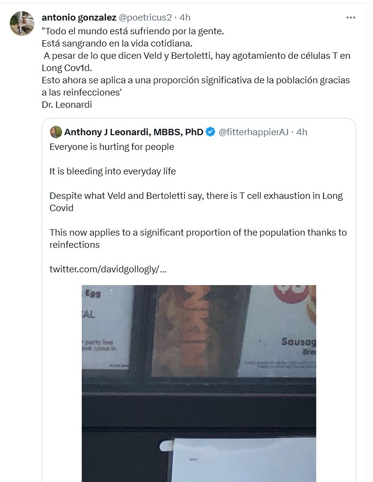 «Todo el mundo está sufriendo por la gente. Está sangrando en la vida cotidiana. A pesar de lo que dicen Veld y Bertoletti, hay agotamiento de células T en Long Cov1d. Esto ahora se aplica a una proporción significativa de la población gracias a las reinfecciones’ Dr. Leonardi