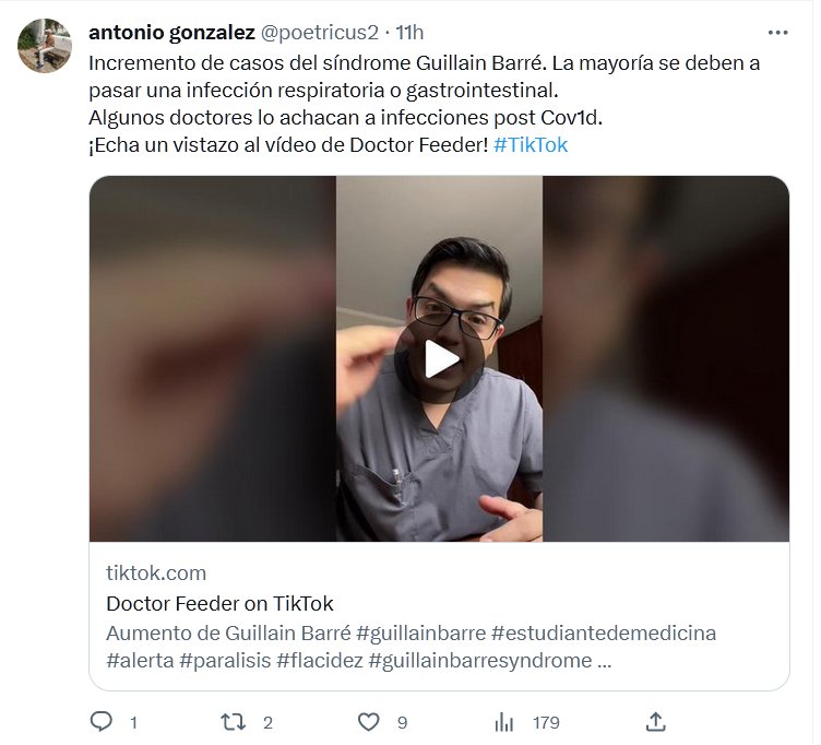 Incremento de casos del síndrome Guillain Barré. La mayoría se deben a pasar una infección respiratoria o gastrointestinal. Algunos doctores lo achacan a infecciones post Covid. Posted on julio 5, 2023 por coronado https://www.tiktok.com/@doctor.feeder/video/7251315754337946885?_t=8diuqLerX1W&_r=1