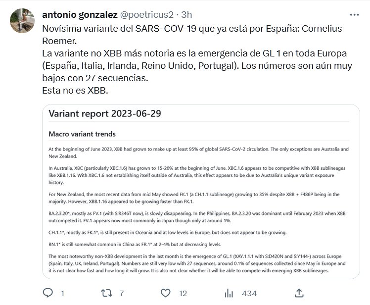 Novísima variante del SARS-COV-19 que ya está por España: Cornelius Roemer. La variante no XBB más notoria es la emergencia de GL 1 en toda Europa (España, Italia, Irlanda, Reino Unido, Portugal). Los números son aún muy bajos con 27 secuencias. Esta no es XBB.