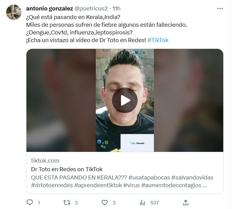 ¿Qué está pasando en Kerala,India? Miles de personas sufren de fiebre algunos están falleciendo. ¿Dengue,Covid, influenza,leptospirosis? Posted on julio 5, 2023 por coronado https://www.tiktok.com/@drtotoenredesoficial/video/7252123824634858758?_t=8divE9vjoYE&_r=1