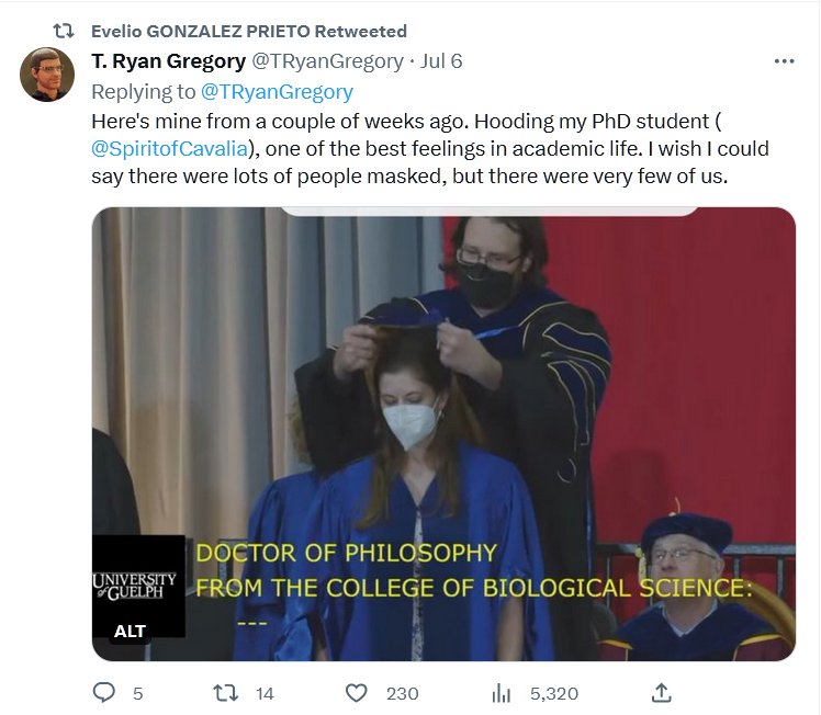 EN INGLÉS: DR. T. Ryan Gregory @TRyanGregory · Aquí está el mío de hace un par de semanas. Encapuchando a mi estudiante de doctorado (@SpiritofCavalia ), uno de los mejores sentimientos de la vida académica. Desearía poder decir que había mucha gente enmascarada, pero éramos muy pocos.