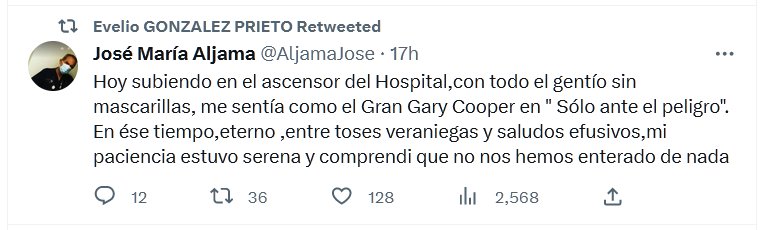 Hoy subiendo en el ascensor del Hospital,con todo el gentío sin mascarillas, me sentía como el Gran Gary Cooper en » Sólo ante el peligro». En ése tiempo,eterno ,entre toses veraniegas y saludos efusivos,mi paciencia estuvo serena y comprendi que no nos hemos enterado de nada