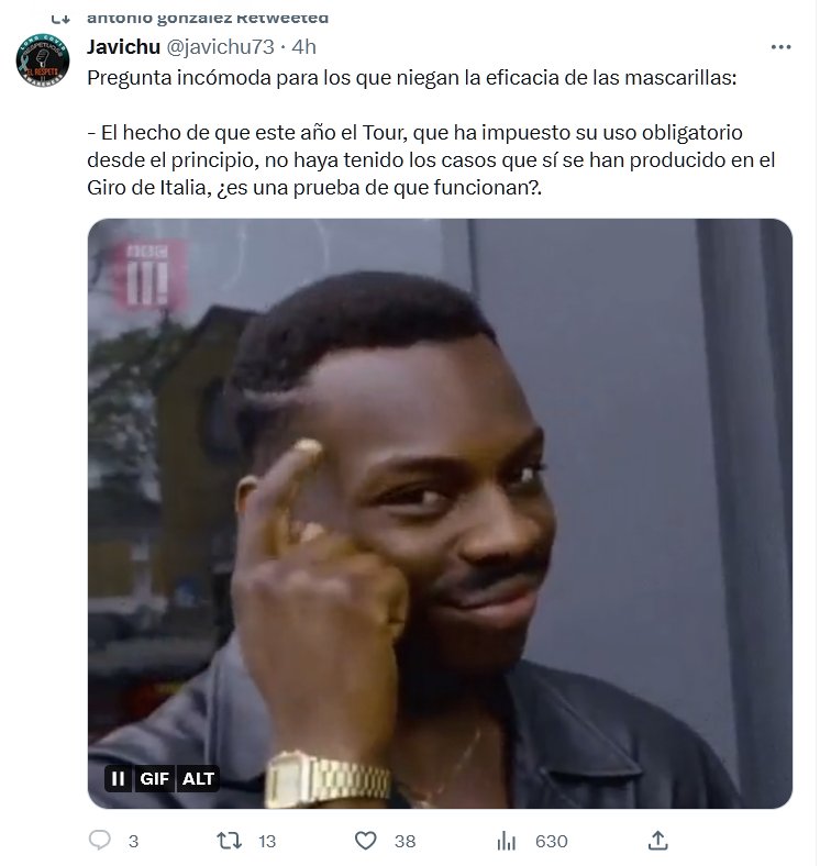 Pregunta incómoda para los que niegan la eficacia de las mascarillas: – El hecho de que este año el Tour, que ha impuesto su uso obligatorio desde el principio, no haya tenido los casos que sí se han producido en el Giro de Italia, ¿es una prueba de que funcionan?.