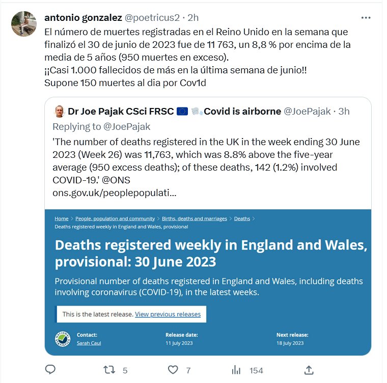 LA ÚNICA VERDAD ES LA REALIDAD El número de muertes registradas en el Reino Unido en la semana que finalizó el 30 de junio de 2023 fue de 11 763, un 8,8 % por encima de la media de 5 años (950 muertes en exceso). ¡¡Casi 1.000 fallecidos de más en la última semana de junio!! Supone 150 muertes al dia por Covid