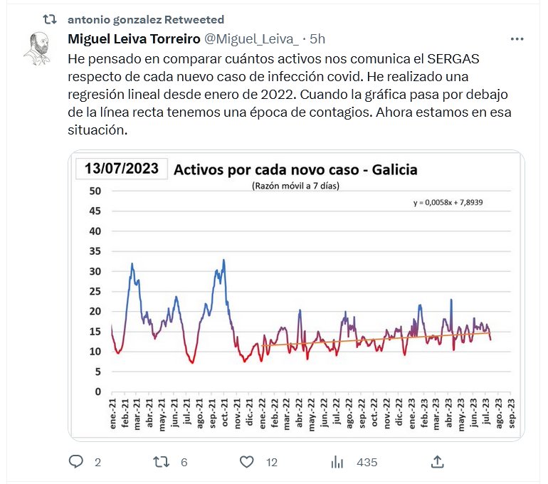 SIN LOS SOBREPICOS DEL PRINCIPIO, PERO TENDENCIA EN ALZA He pensado en comparar cuántos activos nos comunica el SERGAS respecto de cada nuevo caso de infección covid. He realizado una regresión lineal desde enero de 2022. Cuando la gráfica pasa por debajo de la línea recta tenemos una época de contagios. Ahora estamos en esa situación.
