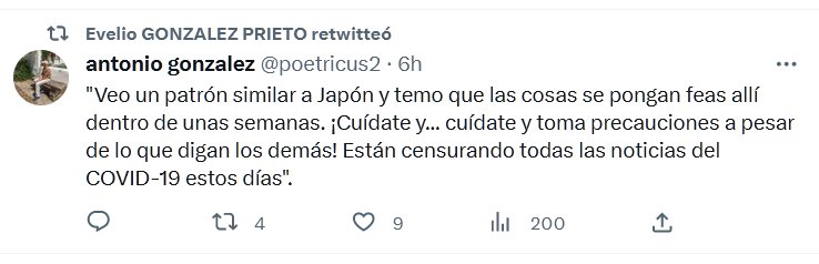 «Veo un patrón similar a Japón y temo que las cosas se pongan feas allí dentro de unas semanas. ¡Cuídate y… cuídate y toma precauciones a pesar de lo que digan los demás! Están censurando todas las noticias del COVID-19 estos días».