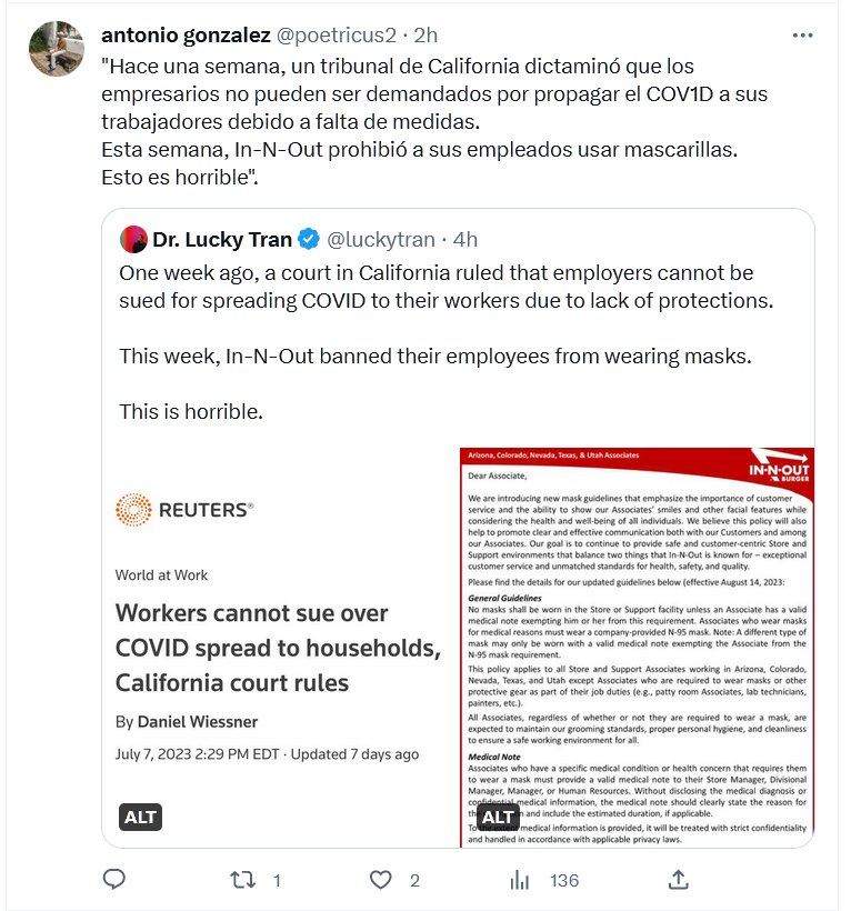 CAPITALISMO ASESINO «Hace una semana, un tribunal de California dictaminó que los empresarios no pueden ser demandados por propagar el COV1D a sus trabajadores debido a falta de medidas. Esta semana, In-N-Out prohibió a sus empleados usar mascarillas. Esto es horrible».